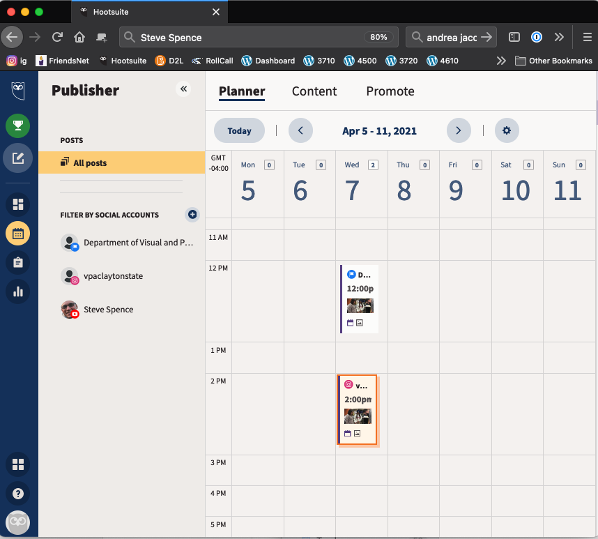Using Hootsuite, create and schedule two posts to appear at 12 p.m. (Facebook) and at 2 p.m. (Instagram) on Wednesday, April 7.
